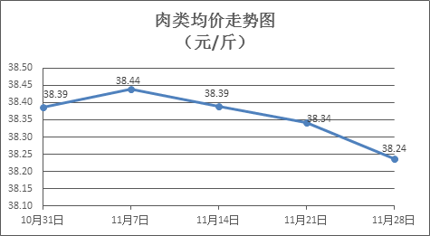 肉类商品价格总体微降。本周所监测的8种肉类商品价格波动情况为3涨5跌,综合零售均价为38.24元/斤,环比下降0.28%。其中:排骨、精瘦肉、有皮上肉、牛肉零售均价分别为每斤35.61元、25.10元、20.86元、54.66元,环比分别下降1.06%、下降2.37%、上涨0.72%、下降0.27%。
