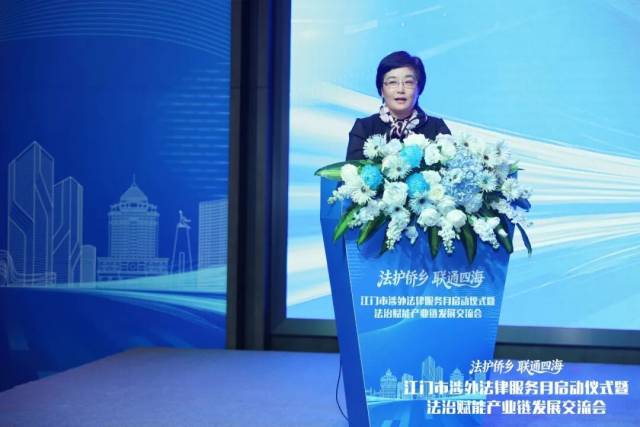 芶晓彤在致辞中表示,法治就是最好的营商环境。一直以来,市委、市政府始终将优化营商环境作为“一号改革工程”来抓,加快推进重点领域和关键环节改革,为市场经营主体高质量发展培育肥沃土壤。但从发展形势与现实需要来看,当前江门仍然存在法律服务业供给能力不足、法律服务与重点产业集群、跨境经贸合作等领域融合度不高的问题,高端复合型涉外法律人才短缺问题依然突出,一定程度上制约了营商环境优化提升与更高水平对外开放。她强调,要坚持有效市场和有为政府相结合,善于用法治的手段激活市场活力,加快形成既“放得活”又“管得好”的经济秩序。一方面要加快构建“产业链+法律服务”新格局,围绕“一业一策”思路,推出更多定制化、专门化“法治方案”;另一方面要提升涉外法律服务质效,通过加强合作交流,搭建合作平台,做优做强高端涉外法律服务。