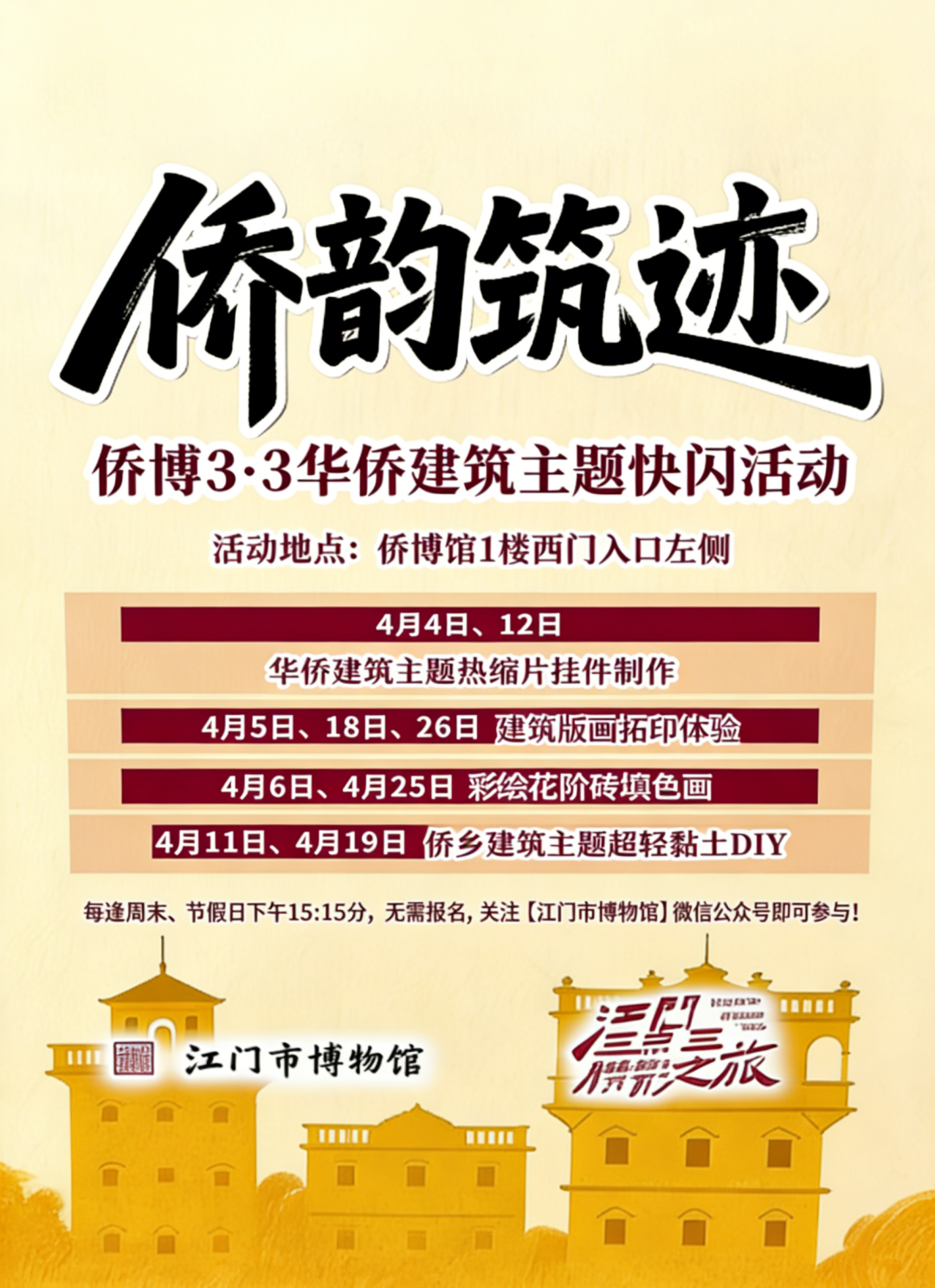 无需复杂报名,无需额外费用,每逢周末、节假日15:15,关注【江门市博物馆】微信公众号,即可走进博物馆,一边解锁华侨建筑的百年底蕴,一边亲手创作专属侨韵手作,让建筑之美、侨乡之情,定格在指尖时光里。