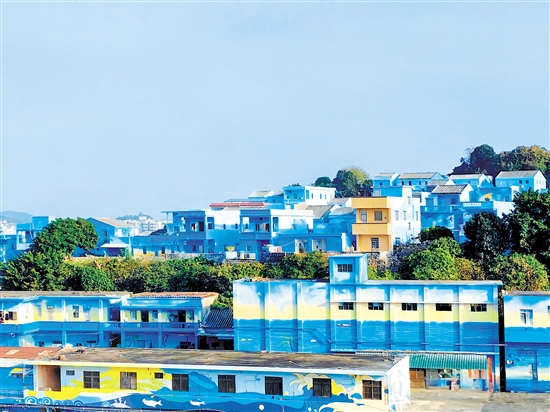 经过改造后,鲲鹏村的旧房屋披上具有海洋元素的“外衣”(上图),村容村貌明显改善。