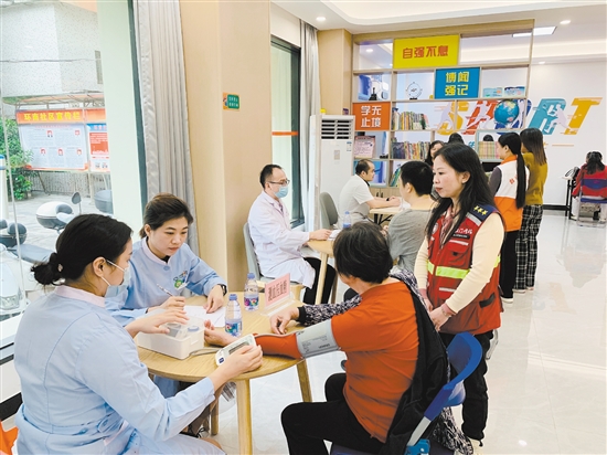 近日,环南社区党委积极对接广东省第二人民医院、台山市中医院,举办“联建共促健康行,党日义诊惠民生”体检活动。14名医护人员为社区长者提供了多项常规检查,并详细询问日常生活习惯、既往病史,根据长者的身体状况和用药情况给予专业意见。义诊结束后,社区工作人员及时把80多名就诊人员的健康信息整理归档,落实电话或入户回访。