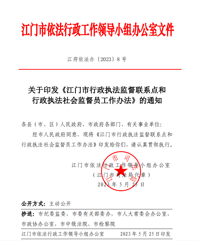 近日,江门市依法行政工作领导小组办公室印发《江门市行政执法监督联系点和行政执法社会监督员工作办法》,进一步完善行政执法监督工作机制,拓宽行政执法监督公众参与途径,广泛听取公民、法人、社会组织、村(社区)等对行政执法工作的意见和建议,促进行政执法部门严格规范公正文明执法,以高水平法治服务江门经济社会高质量发展。这是江门市司法局、江门市依法行政工作领导小组扩大法治江门建设公众参与度的又一大创新举措。