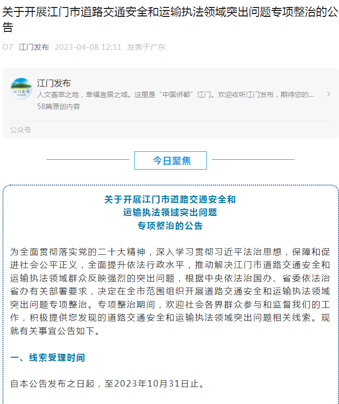 在“江门发布”微信公众号、南方日报等主流媒体上发布《关于开展江门市道路交通安全和运输执法领域突出问题专项整治的公告》,公开线索举报电话热线、举报邮箱、举报平台。同时,创新方式方法,通过群众喜闻乐见、通俗易懂的漫画形式,深入浅出讲解举报违法线索类型,让更多的群众知晓如何举报、举报什么、如何处置,形成闭环式管理,做到“件件有落实,事事有回音”,这是市道路交通专项整治办推出的一系列强有力举措,也得到了人民群众热烈的支持和回应。