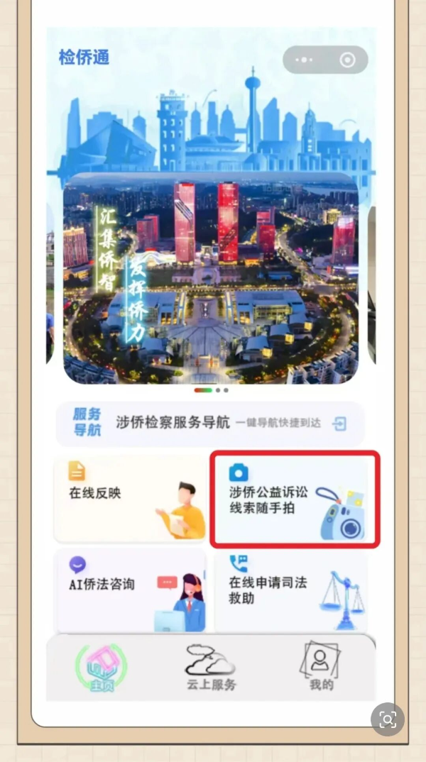 配置涉侨公益诉讼线索反映、涉侨法律问题智能咨询、司法救助申请、远程视频听证等场景应用,开设华侨华人投资兴业检察服务专区和侨界未成年人权益司法保护专区,拓展可链接跳转至“12309检察服务中心”“码上关爱”等线上平台功能,不断完善检侨合作机制,着力加强涉侨检察综合履职,持续提升侨益司法保护水平。